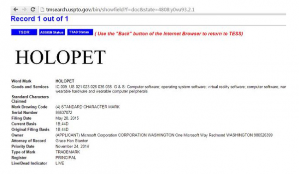 以HoloPet为关键字,在美国商标专利局上可以查询到上图的资料,记录中显示这个商标将应用于下列商品与服务:电脑;操作系统;虚拟现实;计算机软件即,软件设置,操作,配置,控制可穿戴硬件和可穿戴计算机外围设备。