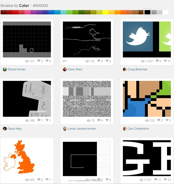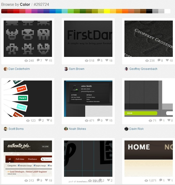 这里不妨用Dribbble来做个测试,搜索一下近黑和纯黑,你看看哪个页面看起来更舒服? shots with pure black (纯黑) shots with “real black” (近黑)