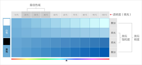 即:用纯白色(#ffffff)和纯黑色(#000000)通过"叠加"和"柔光"的混合模式(效果类似调整饱和度和明度),在任意一个色彩上得到最匹配的颜色(然后通过调整透明度选取最适合的辅色)。