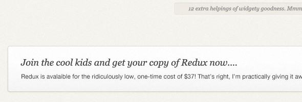 注意观察Redux暗色背景上的浅色文字,你会发现它们都被添加上了投影效果。现在我们可以使用CSS3中的text-shadow属性来完成文字的投影设计,代替了在Photoshop中完成此项工作。而且使用CSS3来给文字添加阴影自由度更高,在浏览器支持的情况下,你可以给任意文字添加你想要的阴影效果。当然IE8以下版本的浏览器是不支持此项属性的,这是我们在设计中需要注意的地方。另外,和前面提到的其它设计细节一样,阴影的效果也要足够柔和,不可过于强烈,不然很容易让整个设计看起来有一种脏脏的感觉,显得不够精致。