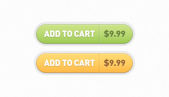 而在下面这个设计好的按钮中,绿色和黄色边框顶部向下1个像素也能看到一条颜色更浅的线条,而这条衬线制作的更为精细,因为它应用了蒙版,从顶部向下你会发现这条衬线渐渐隐去了。另外,在”Add To Cart”和”$9.99″两个文字之间的分隔线实际上是两条线,左边颜色深一些,右边颜色浅一些,这样就能产生线条的凹陷效果。