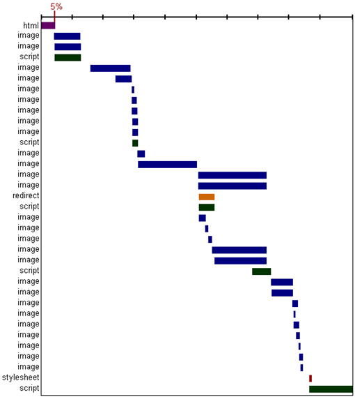以上图标的第一个标签就是html,是一个html文档最开始加载的东东,在这个例子中,读取html代码只占了整个响应时间中的5%,这个结果适用于绝大多数网站,在采样美国的前十位网站中,只有一家超过5%但少于20%,其余80%的时间是用来读取网页其他内容的,也就是说,前端(原文是front-end,意思就是不包括html代码的其余内容,可以是图片,脚本,flash,视频,各种东西)。这就是为什么我们要把目光集中在这些东西来提高显示速度的关键原因。