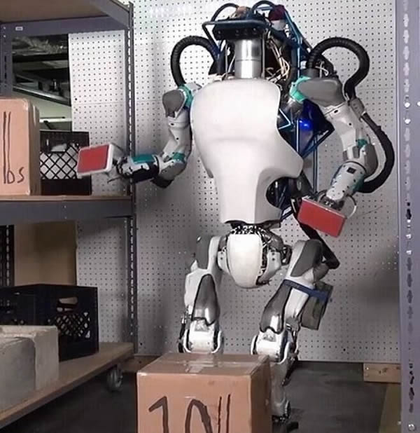 这款Atlas人形机器人高5英尺,重180磅,除了可以像人类一样正常行走之外,它还可以处理多种不同情况下的物体搬运任务。即使遇到百般阻挠,它还是能够坚持把地上的物体捡起来继续搬运。