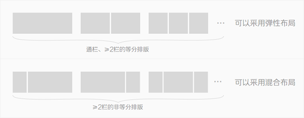 其中可切换的固定布局的实现成本最低,但拓展性比较差;而弹性布局与混合布局效果具响应性,都是比较理想的响应式布局实现方式。只是对于不同类型的页面排版布局实现响应式设计,需要采用不用的实现方式。通栏、等分结构的适合采用弹性布局方式、而对于非等分的多栏结构往往需要采用混合布局的实现方式。