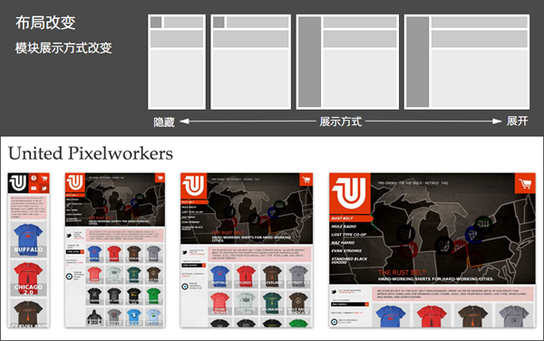 可切换的固定布局:同样以像素作为页面单位,参考主流设备尺寸,设计几套不同宽度的布局。通过设别的屏幕尺寸或浏览器宽度,选择最合适的那套宽度布局;