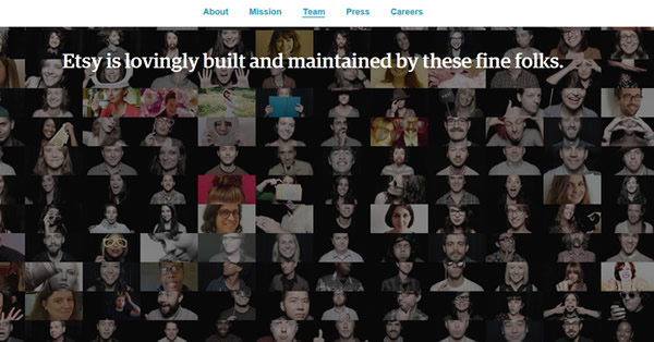 Etsy的“团队”页面。每个团队成员照片链接到各人简介页面。这种个性化的设计无论是对于客户还是公司的第三方供应商来讲是都很棒的。