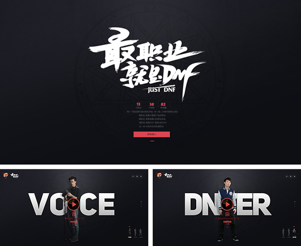 例如:“最职业DNF”主题站,为打造最具丰富并个性差异职业体系,采用精致的大标题设计,结合简单的背景,重点突出又不失美观。