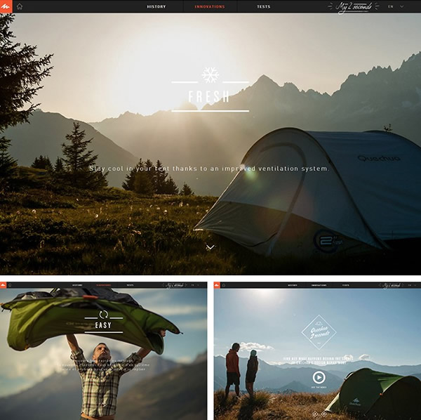 例如,Quechua山地运动品牌,通过几张照片和简单文字的说明,将Quechua帐篷的特点及所处环境真实体现,仿佛一场美妙之旅让人心动。