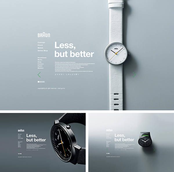 例如:BRAUN博朗,整个页面,简洁的图片与文字的排版,让视线非常集中,这样用户快速的将注意力集中到内容上去,非常符合他们的主题“Less,but better”,给人留下回味、想象的空间。