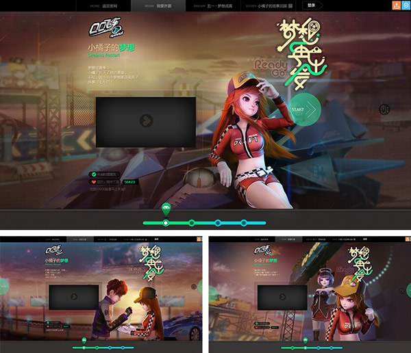 例如:QQ飞车“梦想再出发“预热站,将大背景铺满整个页面,每个画面都含不同的寓意,增加了游戏的代入感,给人轻松、愉悦的感觉。