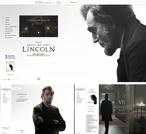 例如:LINCOLN电影网站,运用最常用的黑白两种颜色搭配,让网页如此简约大方,给人留下无限想象空间。