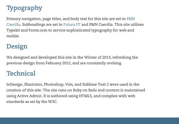 在欧洲,在书中使用Colophons(题跋)可以追溯到15世纪的时候(中国就早很多了),不过这个网站是为了将其运用到网站上去。这次,Neoteric Design分享了他们网站的制作笔记——各个部分的功能,从字体软件到编程语言和内容管理系统。如果访客想知道一个网站是如何构建起来的,那么这个带题跋的笔记可以帮助用户方便快捷得了解这个网站的构建过程,满足好奇心。