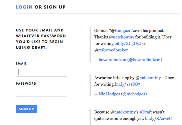 当我们讨论登录/注册页面的时候,可以轻松脑补出页面的造型——其实绝大多少的页面都差不多,本质上也就是个表单。但是有人并不打算随大流。曾经开发出著名应用Draft的Nathan Kontny,他在设计页面的时候,将用户的留言添加到表单右边,将互动与沟通的氛围呈现出来,吸引更多的潜在用户来注册。