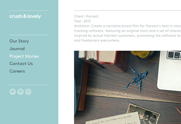 StudioCrush是一个用来展示各种项目故事的网站。网站将叙述方式简化了下来,每个项目本质上就是从开始(项目起源)到结束(项目交付)的过程,中间由关键的叙事线索(过程)桥接起来。