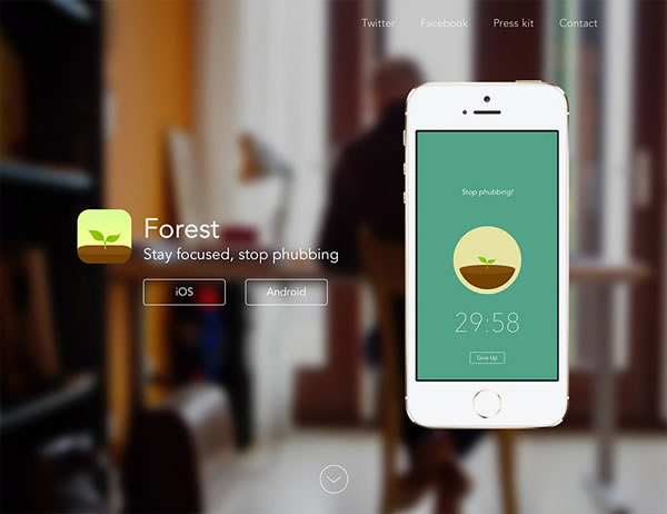 Forest是一款能够帮助用户以30分钟为单位集中时间和注意力的工作效率提升应用。其登陆页看起来比较松散,近似极简主义,但仍然很好地解释了产品简单而上档次的理念。