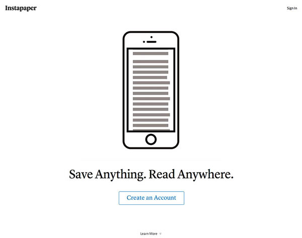 Instapaper是比较成功的一款阅读储备应用,其特点是应用界面简单、简约。其登陆页面也集产品之大成,虽然有大量的留白空间,但却展现出了一切必要信息,没有乱七八糟的东西。