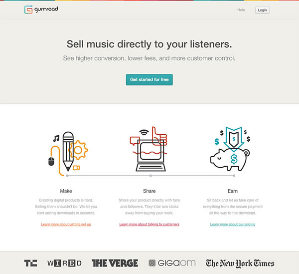Gumroad可提供网上销售服务,用户还可通过其系统收款。其登陆页面踩中了很多设计最佳实践方式:有明确的方向指引(大大的“免费设立”按钮)、用词巧妙的操作引导、与之合作的大网站的logo,还有用精美插画绘制的整体流程方式。