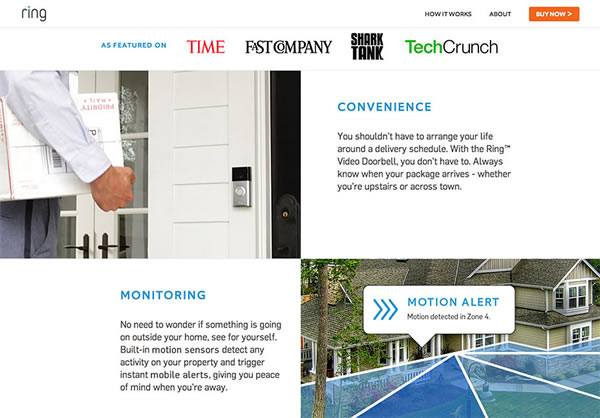 Ring是一款门铃产品,不在互联网圈子内。其内置的摄像头可以让你通过手机看到门前来者,甚至还能检测到自己房屋周边的动作情况并向你发送警报。这是个比较新奇的理念,所以可能需要详加解释一番,其登陆页面充分而优雅地展示出了产品的所有好处。