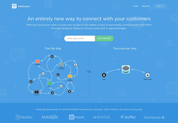 Intercom服务可帮助用户提高向客户发送电子邮件的效率。其登陆页采用了相对比较复杂的理念以便大家理解产品工作原理以及好处所在。这个设计中我最喜欢的是对比展示旧有工作方式和Intercome的简便方法。