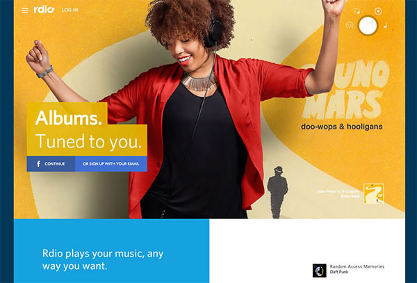 Rdio提供在线音乐服务,其拥有一套制作精良的登陆页。页面典雅、简洁,并采用了大量留白空间和大幅的满屏图片,营造出能够吸引眼球的大胆设计。
