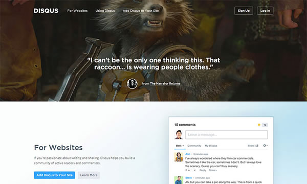 Disqus可通过嵌入代码帮助网站所有方在网站任意位置添加评论功能。Disqus一直崇尚创意、巧妙并且设计精巧的登陆页,而其最新的登陆页版本又加入了一个新元素:个性化。其将主页的标题部分打造成了一个不同寻常、有趣且好玩的评论幻灯片,给整体设计精美的页面带来了另一丝魅力。