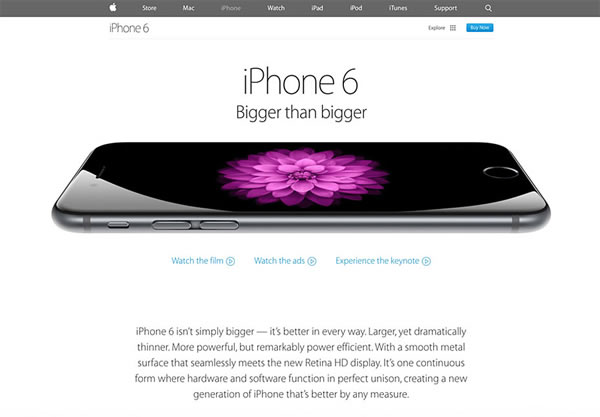iPhone 6的登陆页面采用了其标志性地营销风格——大量留白、巨型方便阅读的文字和高质量的图片衬托白色背景。不仅如此,公司还加入了相对比较微妙的动画效果——向下滚动鼠标时,手机会以视差的形式自己移动。这一切元素共同组成了一套漂亮、容易领会而且具有苹果风格特色的登陆页。