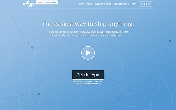 Shyp是一款旨在简化包裹发运工作的服务。其流程是首先用手机应用拍摄物品照片,准备发运,然后Shyp会负责完成剩下全部工作。考虑到这个想法比较不寻常,所以需要比较复杂的解释工作来展现出这项服务的简单和直接,而这也就是登陆页面的作用了。用户滚动鼠标时,可以看到分步骤的服务流程,并领会到这一切有多简单和方便。