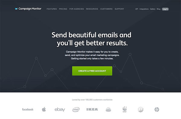 打造简单雅致的登陆页面看似简单做起来难,但是Campaign Monitor出手不凡。这是我印象中最简单但最漂亮的页面。其同样踏中了最正确的节奏:有力的标题、撰写得当的介绍语准确说明软件的好处、显眼的操作引导以及一片正在使用其软件的知名公司名称。