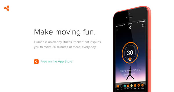 Human是一款能够跟踪健身水平、卡路里摄入等的iPhone应用。其推广产品的登陆页面在一定程度上采纳了苹果的设计风格,使用了大型的文字、大量留白和巨大粗犷的图片。其简约的设计一笔到位,没有废话,而且看起来也很不错。