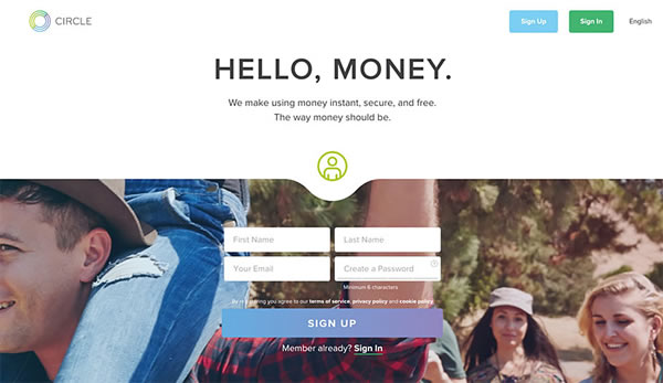 Circle是一项比较新颖的服务,其可辅助你使用比特币买东西。公司登陆页面有几个方面做得非常好,比如在多个位置放置注册表单,而不是单独跳出页面。另外,其还采用了几个其他设计诀窍。鼠标滚动时,其背景图片上采用了比较聪明的视差效果,但大型的图片并不会原地不动,而是会缩小到远景,营造出不同寻常的运动感。
