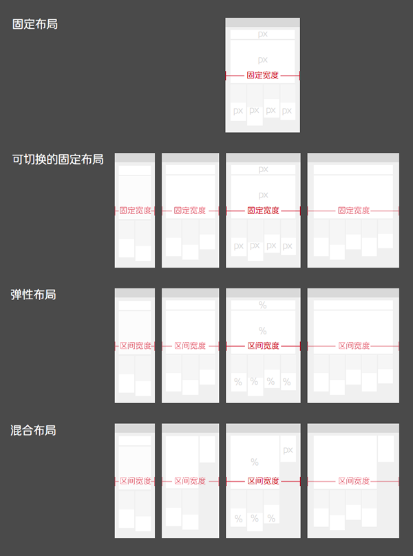 采用何种方式实现布局设计,也有不同的方式,这里基于页面的实现单位而言,分为四种类型:固定布局、可切换的固定布局、弹性布局、混合布局。