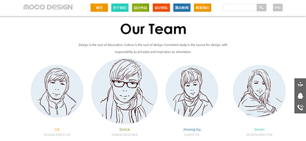 在用户操作之后发生一些适当的交互效果,这是最能让用户感受到自身存在感的方法之一,正如@AnyForWeb_UED 为MOCO Design设计的网站。鼠标悬停在导航位置时出现油漆状的效果,不仅在美观度上加分不少,也让用户及时获得了他们所希望的简单反馈。团队介绍页面摒弃了常规的设计模式,使用了手绘风格的表现形式,也在鼠标悬停时产生了图片放大效果。