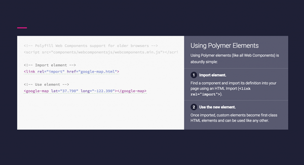 而这就是Web Components所能做的事情,但是现在很多设计师都没有用它把自己给武装起来。而现在谷歌Material design就是一个很好的开始,它提供了丰富的动画和交互方面的组件,用户只需要如下图般简单几行代码就能进行使用: