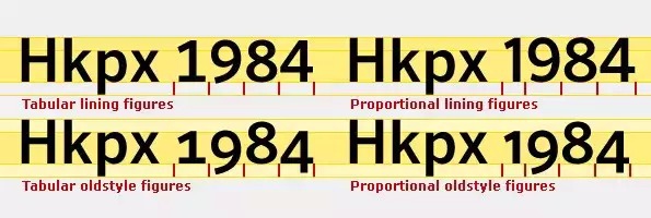 很多专业级的字体都具有几个不同的数字字符集。每个字符集都有它特殊的用途。表格式数字占据相同的空间,让它们垂直排列,而宽度比例数字与其设计相符– 举例来说,数字4要比1宽得多。一方面,旧式风格数字的设计模仿了带X高度属性,上行和下行字母的的小写字符,使其与大小写混合的文本完美融合。另一方面,内衬的数字用于数值,或与大写文本一起使用。