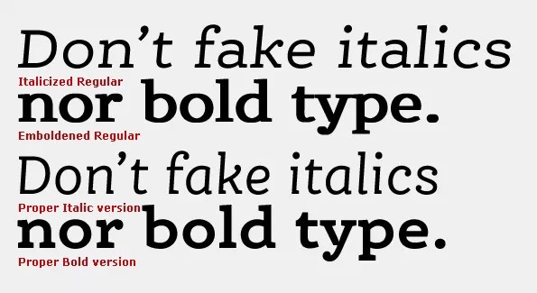 CSS使你可以伪造一些事情。如果字体本身没有粗体的变体,<b>标签可以通过双重渲染+略微侧移的方式将文本人为地加粗。为没有斜体样式的字体加上<i>标签可以实现斜体效果。由此产生的扭曲字符令人惨不忍睹。