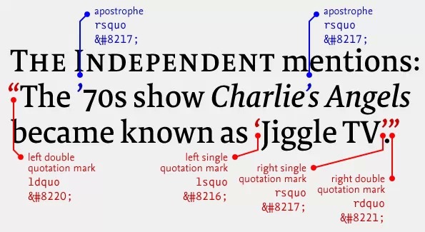 说到撇号,正确的形式应该是闭合单引号。一个凸显出不成熟的例子是直引号的使用,它同时也被注重形式的设计师称为‘哑巴引号’。然而,使用合适的卷曲单引号或双引号是不够的。不同的语言有不同的引号使用形式。举例来说,法语使用的引号是指向外侧的三角标识符,而在德语中引号的方向则指向外侧。