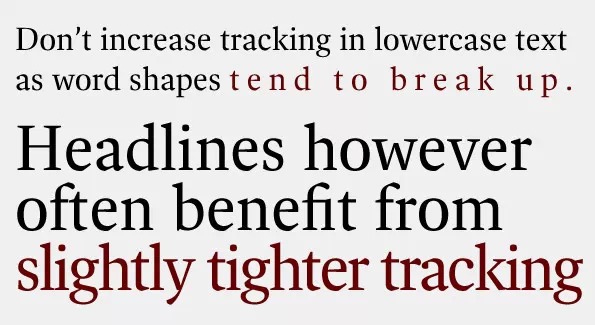 对于阅读体验而言,字符之间与内部的间距与字符本身同样重要。正确的层次结构是字距<词距<行距。应避免在字母之间添加空格,这会令单词隔开并影响可读性。增加字距只能保证对字号很小的文本产生影响。与之相对的是显示尺寸常常受益于紧密的排列,但同样要适度。