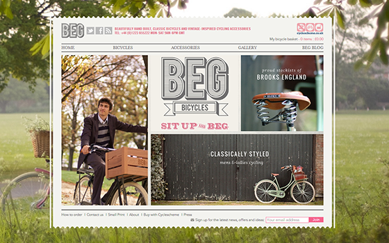 4.Beg Bicycles网站在不同位置使用了多种字体,logo、导航、图片里的文字等,这些文字并没有让网页布局显得混乱,反而引导用户的视觉有层次地展现不同板块的内容,营造出清新和淡淡的复古感。