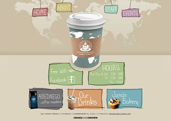 7.C&C Coffee Company网站的手写风格字体与网页里其他元素巧妙呼应,在色彩和布局上展现了高度的统一,网站整体在视觉上传达着手工特色,与产品本身具备的特色保持着一致。