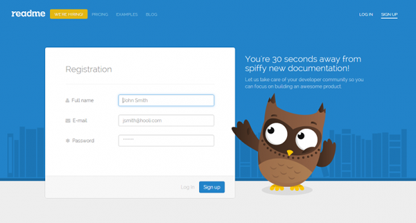 在 Readme.io 这个网站中,猫头鹰会随着操作而变化,当用户输入密码的时候,会非常可爱地盖住自己的眼睛。动效和动画的加入让页面无形中加入了更多的互动,显得更加引人入胜了。同样的,Shopify 在注册界面中,会用弹出的标签动效来帮助用户了解下一个操作步骤。