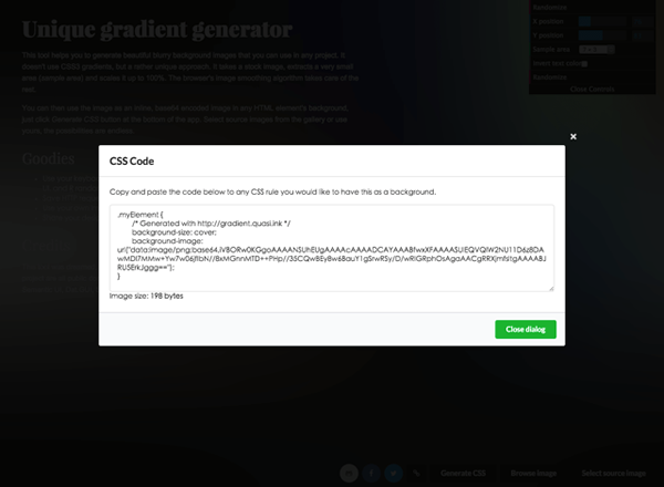 另一大特色是:Unique Gradient Generator 不会产生冗长的 CSS 程序代码!网站生成的原始码非常精简,使用 base64 编码,只有几 bytes 大小。如果你是网站开发者,想要一个简单又不会过于单调的背景图,这是不可多得的好工具。