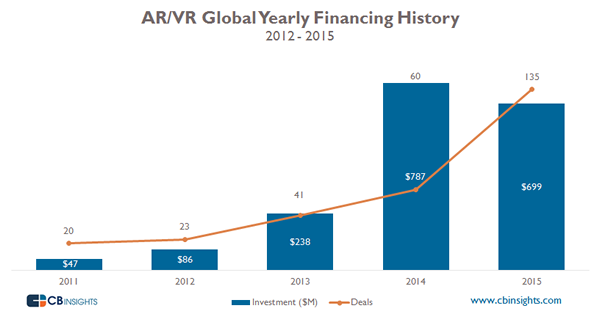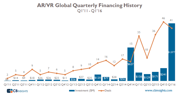 随着公众对虚拟现实头盔的接触越来越多,如Oculus Rift 和 HTC Vive,投资也在向这个领域流动,2016年第一季度41宗交易,投资额高达11亿美元。