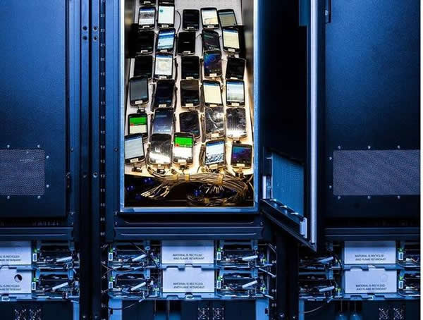 为了测试苹果的设备,其中一个机架安装了8台Mac Mini,每台连接4部iPhone。团队会驱动手机安装、测试及卸载应用。为了测试Android手机,Facebook在每个机架上安装了4台OCP Leopard服务器,而每台服务器连接8部Android手机。