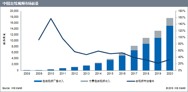 根据IHS Markit Advertising Intelligence Service和Broadband Media Intelligence Service,电视广播公司和外国在线视频服务提供商对于中国的在线消费内容方面的创造发挥了关键作用,但是不同于大多数成熟市场,中国的在线视频平台主要以网络为主的中国公司为主导,例如优酷、土豆、爱奇艺、乐视、腾讯视频和搜狐视频。他们不仅制作内容,而且生产播放器设备出售其订阅内容,他们还拥有自己的社交媒体平台并通过这些平台进行进一步推广。腾讯的微信支付、阿里巴巴支付宝等支付系统令视频内容订阅及交易变得更加简单便捷。相较之下,例如YouTube和Netflix等国外知名在线视频网站,由于中国政府的相关规定,没能在中国在线视频行业格局中占有一席之地。
