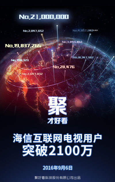 9月7日,海信宣布互联网电视激活用户数突破2100万,1年多的时间用户量倍增。蝉联全球用户最多的互联网电视平台并刷新纪录。在中国,每5个互联网电视用户,就有1个是海信。