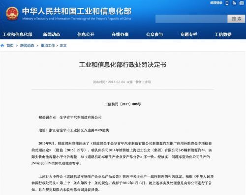 目前,工信部正式发布《工业和信息化部行政处罚决定书》公告,提出:暂停金华青年汽车制造有限公司、上汽唐山客车有限公司、重庆力帆乘用车有限公司、郑州日产汽车有限公司、上海申沃客车有限公司、南京特种汽车制配厂有限公司、重庆恒通客车有限公司等七家汽车企业申报新能源汽车推广应用推荐车型的资质。
