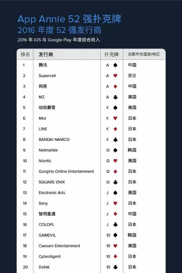 App Annie 52 强榜单由2016年1月1日至12月31日iOS与Google Play 综合收入排行榜上的前 52 位优胜者构成。收入排名的依据是从iOS App Store与Google Play商店的付费下载及应用内购获得的收入。不包括通过应用内广告或应用商店渠道之外的订阅获得的收入,中国第三方 Android 市场数据不在计算范围内。