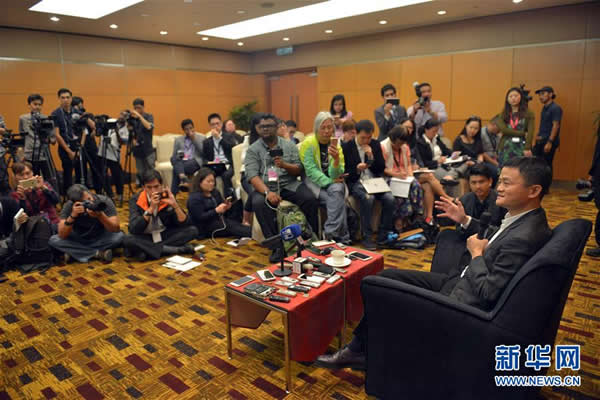 3月23日,在马来西亚吉隆坡,阿里巴巴集团董事局主席马云(前)对媒体讲话。阿里巴巴集团董事局主席马云23日在吉隆坡出席马来西亚政府举办的“全球转型论坛”活动期间对媒体表示,中国提出的“一带一路”倡议为沿线国家的中小企业带来机遇,包括马来西亚在内的各国将会从中受益。
