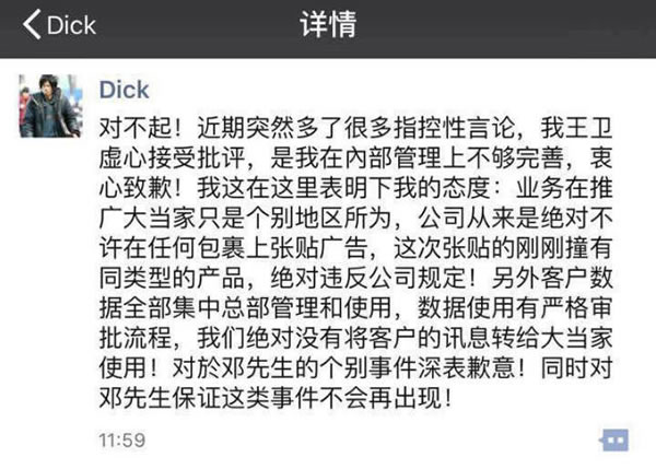 邓健先生:您好,我是顺丰速运大连区区总侯爱鸣,对于在我的管辖范围内发生因法律意识淡薄,在生鲜产品外包装私自张贴商流信息二维码行为,我负有失察和管理责任,在这里我个人做出深刻检讨并向您致歉。