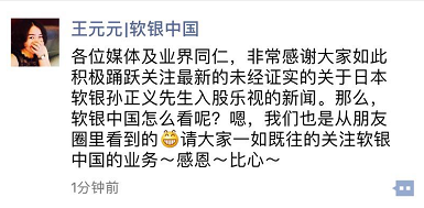 对此,软银中国公关总监王元元微信朋友圈称,各位媒体及业界同仁,非常感谢大家如此积极踊跃关注最新的未经证实的关于日本软银孙正议先生入股乐视的新闻。那么,软银中国怎么看呢?嗯,我们也是从朋友圈看到的,请大家一如既往的关注软银中国的业务,感恩,比心。